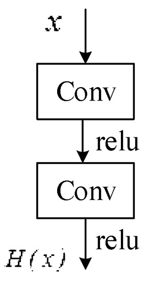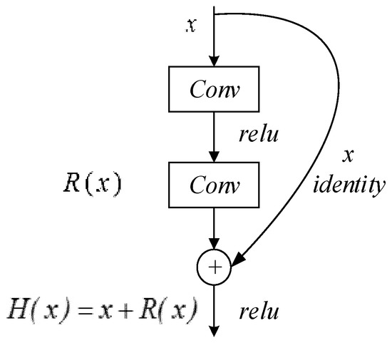He et al. [21] add a shortcut connection to the ordinary network architecture, as shown in Figure 2, so that the residual is described as . With the assumption that the residuals are more easily optimized and fit the residuals mapping with stacked non-linear transformations, the expected mapping turns to , and the problem changes from looking for to . Among them, and require the same size (dimensions must be equal); if their sizes are different, a linear map is required to make and the same size.