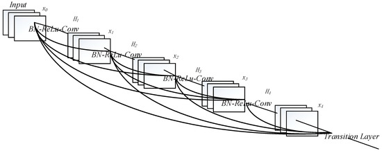 To further improve the information flow between layers, G. Huang [23] propose a new network architecture, DenseNet, which is a more radical dense connection mechanism. The lth layer of the network receives the feature-maps of all preceding layers, and refers to the concatenation of the feature-maps produced in layers 0, …, , that is, the channel is merged in depth. For ease of exposition, the above approach is named DenseNet-LP.
