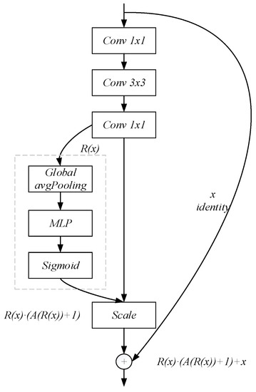 G is the channel characteristic weight distribution calculated by Equation (3); denotes the calculation of MLP; and is the sigmoid function. Therefore, is clarified into (0, 1). Inspired by residual learning, if the attention unit can form the identical mapping, its performances should be no worse than its counterpart without attention. Thus, we modify the model into: