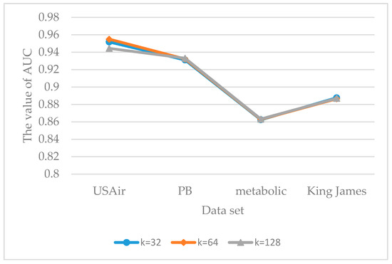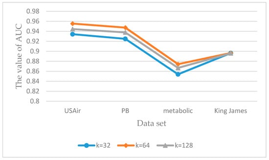 - Node information matrix construction: the experiment sets . Through the experiment contrast, when , the prediction accuracy of AUC is relatively good, so we chose the size of , as shown in Figure 6.