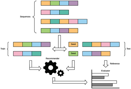An illustration of the evaluation procedure. First, the set of sequences is split between training and test set. Then, the recommender is trained with the sequences available in the training set. Finally, the recommender is asked to generate a sequence for each seed from the test set; such sequences are compared with the corresponding reference sequences.
