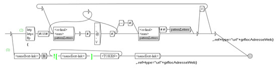 The graph shown in Figure 1 is the first in our cascade. The principle of a cascade is simple: Each graph of the cascade parses the output text of the preceding graph. The graph order is difficult to decide but it is very important for a good parsing. For instance, you have to recognize a building name like Charles de Gaulle airport after you recognized Charles de Gaulle as a person’s name. Another example is shown in Figure 2: to encapsulate URL, you have to use the XML tags ext-link, if these exist in the paper (1) or you have to describe the URL (2).