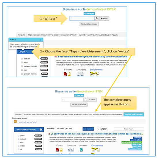 We can obtain this complex query using the facets available on the Istex demonstrator: Click on “Continuer”, write a “*” as a keyword, choose the facet “Types d’enrichissement” and click on “unitex” (see Figure 4). Then copy the query, and paste it into your browser.