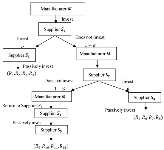 (3) This study focuses on the analysis of game relationships within GSC, and subsequent research can be extended to the analysis of game relationships with external stakeholders. Therefore, we assume that external stakeholders have reached a game equilibrium, that is, consumers are willing to purchase green products produced by manufacturers, and the government will supervise manufacturers to implement green investment. Manufacturers are motivated to develop green products, the costs of which includes production process improving, procurement of related equipment, and R&D of new products. Referring to D’Asprement’s approach [32], the product R&D cost formula is , where is the R&D adjustment factor and . Supplier and are free to decide whether to respond to the manufacturer’s green investment. R&D costs are all borne by the manufacturer, and suppliers only bear additional green processing costs.