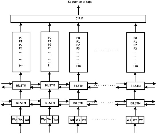 Figure 4 demonstrates the complete architecture of our entity recognition model. The model accepts sequences of length ‘n’. ‘Wp’, ‘Wc’, ‘Wa’ are pre-trained word embedding, character-based word embedding and affix embedding respectively. P0, P1, P2 and so forth, are the emission scores coming from the Bi-LSTM layer. Each of them indicates the probability of a particular tag for a particular word. Hence, ‘m’ corresponds to the maximum number of tags in the tag set. Final predictions are made by the CRF layer based on these probabilities.