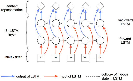 where yt is a sequence input, at is the input to the LSTM unit h at time t, bh is the activation function at time t, wkh is the weight of the input k towards h. whh’ is the weight between the hidden layers h and h’. While the Equations (8) and (9) calculates the backward function of Bi-LSTM.