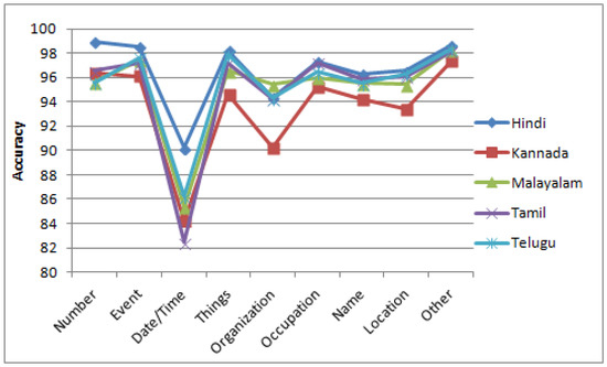 We evaluate our system on ARNEKT-IECSIL 2018 shared data https://github.com/BarathiGanesh-HB/ARNEKT-IECSIL (accessed on 12 June 2018) [55]. ARNEKT-IECSIL was a track in FIRE-2018 with the objective of improving the information extraction systems on Indian languages. FIRE, Forum for Information Retrieval and Evaluation is a South Asian counterpart of TREC and CLEF started in the year 2008 intending to meet the challenges in multilingual information access [56]. The data set contains training and testing data for five Indian languages, namely Hindi, Tamil, Kannada, Telugu and Malayalam. The training data contain words and their corresponding labels in a two column format. The sentences are separated using a ‘newline’ keyword. Similarly, test data contains words without labels separated using ‘newline’ keyword between sentences. Except for Kannada, all the other language datasets contain a sufficient number of sentences (more than 60,000). The training data for each language contain nine tags including name, location, organization, event, things, occupation, number, date/time and other. Table 1 gives details about the dataset used.