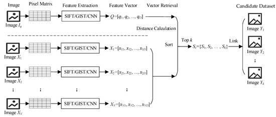 - Extract the features for the query image Iq and for the image dataset I by feature extraction tools such as SIFT, GIST, CNN, and so on. Correspondingly obtain the image feature vector Q = [q1, q2, …, qn] and the image feature dataset X = {X1, X2, …, XN}, where Q is the feature vector of the query image Iq, Xi = [xi1, xi2, …, xiD], and D is the dimension of the feature vector.