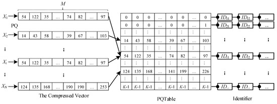 Given a vector dataset X = {X1, X2, …, XN}, Xi ∈ RD, Xi . PQ(Xi) represents the product quantization process of vector Xi, as shown in Equation (7).