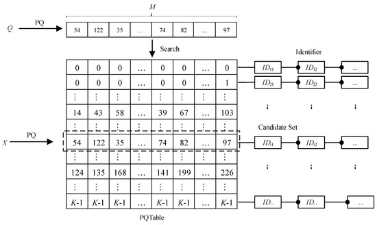 The vector retrieval process in the PQTable is shown in Figure 4. The steps of vector retrieval in detail are as follows: Firstly, each sub-vector of the query vector Q is quantized by the quantizers q = {q1, q2, …, qm}, and we can obtain a compression vector PQ(Q), where the quantizers come from the quantization process of set X. Then, we can use the compression vector PQ(Q) to search in the PQTable. Finally, we can quickly get the candidate set according to the mapping relationship between the original vector and the compressed vector.