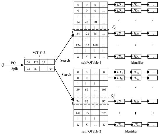 We divide the compressed vector into T sub-compressed vectors whose size is M* = M/T. Then, we construct a sub-quantized table for each sub-compressed vector. In this way, we can get T sub-PQTables, and the size of the table is L* × M*, where L* = KM*. When searching via the query vector Q, the compression vector PQ(Q) is also divided into T sub-compression vectors, namely, PQ(Q) = [subPQ(Q)1, subPQ(Q)2, …, subPQ(Q)T]. Then, we query the subPQ(Q)t in the subPQTablet and get the corresponding candidate set , where 1 ≤ t ≤ T. Finally, we union the T candidate sets and obtain the final candidate set SC, as shown in Equation (8).