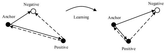 On the basis of the original triple loss function and the new distance learning goals, we easily developed the improved triplet loss function, as shown in Equation (9). Compared with the original triple loss function, the improved triple loss function can realize twice the distance learning only through a triple sample.