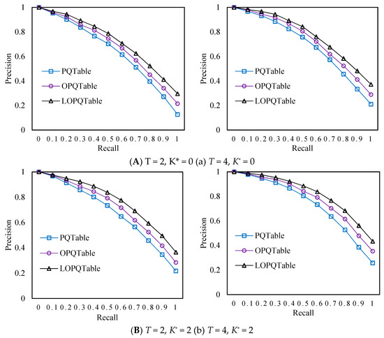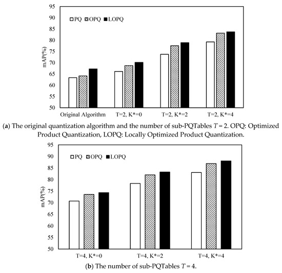 We refer to the relevant vector quantization algorithms, i.e., PQ [24], OPQ [25,26], LOPQ [27] and we set a series of multi-PQTable parameters: K-means clustering center K= 256, size of the compression vector M = 8, number of sub-PQTable T = 2, 4, variable of the generator table K* = 0, 2, 4. In the multi-PQTable query strategy, we calculate the mAP on the basis of the results of image retrieval. The experimental results are shown in Figure 10. In particular, the original PQ, OPQ, and LOPQ do not have multi-PQTable query strategies.