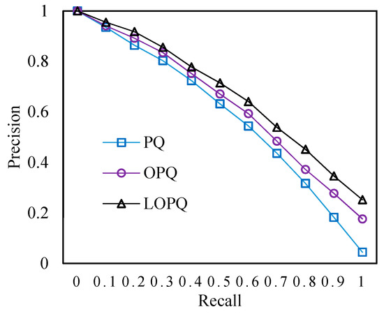 According to the image retrieval results of PQ, OPQ, and LOPQ and their corresponding multi-PQTable algorithms, we calculate the precision rate varying with the recall rate. The experimental results are shown in Figure 11 and Figure 12.