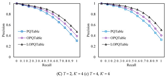 From Figure 11, in the original quantization algorithms, PQ decreases relatively faster than OPQ and LOPQ, which indicates that the accuracy of PQ is greatly affected by the recall rate. According to the small graphs (A), (B), (C) or (a), (b), (c) in Figure 12, in the multi-PQTable query strategy, as the generator table parameter K* increases gradually, the set of nearest-neighbor vectors generated by the generator table increases gradually, and the curve decreases slowly, which shows that the accuracy is less and less affected by the recall rate. As can be seen from the small graphs (A) and (a), (B) and (b), (C) and (c), when the recall rate and the parameter K* are the same, the larger the number T of sub-PQTables is, the harder the sparsity is, and the higher the precision rate of image retrieval is. In addition, when the recall rate and the parameters K* and T are the same, the precision rate of image retrieval is LOPQ > OPQ > PQ. It also shows that LOPQ has better effects and advantages than OPQ and PQ in approximate nearest-neighbor search.
