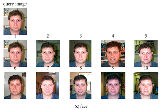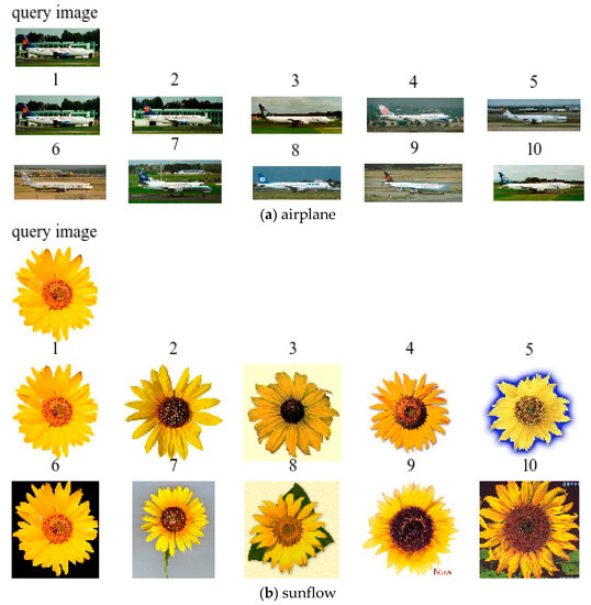 We selected three categories from the Caltech101 dataset, i.e., airplane, sunflower, and face, and randomly selected an image from these three categories as the query target. We cn obtained the top 10 images from the search results, and the retrieval examples are shown in Figure 13. We extract the image feature vectors through the TSPP-Net model and then construct the index structure of the multi-PQTable correspondingly after quantizing and compressing the vectors. In the approximate nearest-neighbor search, we can quickly and successfully retrieve images with similar content or same categories.