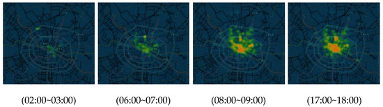In this section, a multi-region travelling demand forecasting method based on deep learning is described. In the process of visualization, we project all order data onto the map according to latitude and longitude. As is shown in Figure 2, the demand for online car-hailing in different regions and times presents a regular change. By analyzing the results of data visualization, we found several interesting phenomena: