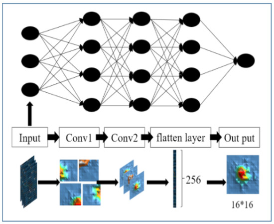 The travelling demand map data are entered into two-dimensional convolution and a non-linear activation operation is added after each convolutional layer. In order to balance the convergence speed of the model and the complex nonlinear characteristics of the data, ReLU is used as the nonlinear activation function because it has been proven that it can eliminate the phenomenon of “gradient disappearance” in the model solution process [25]. In the process of training neural networks, the dropout layer is very useful as it can solve the over-fitting problem [26]. Finally, the flat layer and the fully connected layer are used to transform the output into the one in the real region.