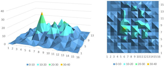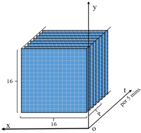 Apart from considering the spatial characteristics of the travel demand data, its variation in time series also needs to be taken into account. The OC-CNN model takes the three-dimensional matrix as the input, input = [16,16,p], where the first and second dimensions are the divisions of the region, the entire prediction area is divided into 256 areas according to latitude and longitude, and the third is used as the time dimension. We employ the number of online car-hailing orders per five minutes in the whole region as the travelling demand map, and then use consecutive p travelling demand maps as the input, as is shown in Figure 4. The x-axis and y-axis indicate that the entire area is meshed, and the t-axis represents time, with a scale of five minutes. Each demand map in the figure indicates the number of travel needs for each small area within five minutes.