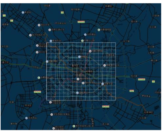 To improve the quality of the data, the data have been preprocessed in this study. According to the results of data visualization, the Chengdu Fourth Ring Region, longitude between (103.930362, 104.216382) and latitude between (30.565334, 30.792188), which contains 97% of records, is selected as the scope of the study with the order data outside the specified area deleted, as is shown in Figure 6. At the same time, the selected area is meshed into small areas of 16*16 according to the latitude and longitude. The experimental data are updated at a frequency of five minutes to ensure that the prediction results have a better timeliness. The quantity of the order in each area is counted every five minutes, and the original data set is transformed into the urban area demand matrix. To construct the data set for the experiment, there is a need to take the travel demand matrix of 5p min before the current time period as the input sample and the travel demand in the next 5 min as a label.