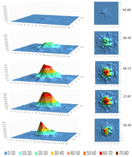 The forecast results in Figure 7 show the demand for online car-hailing in all 256 regions at different time periods. We can see that the model has successfully learned reasonable spatial characteristics. For example, there is a low demand heat in the early morning and when it is the morning peak hour (8:00), the demand rises to a higher value. The model can also reveal the high demand areas of the city, which can demonstrate that central demand areas remain at a relatively high level in different time spans.