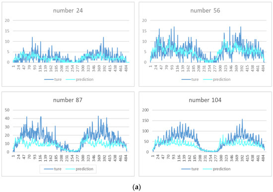 In this part, we select the small areas numbered 24, 56, 87, and 104 and focus on the performance of the model for the accurate prediction of individual areas. The continuous prediction of a single region shows that the model has a perception of the temporal characteristics of the data and obtains the trends of the future demand from the input historical data, as is shown in Figure 9. By comparing No. 24 with No. 104, we find that the prediction accuracy of the model in the low-demand area is significantly higher than that in high-demand areas. The possible reason for this phenomenon is that the relatively higher number of low-demand areas helps the model learn richer features, and vice versa.