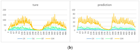 Comparison of continuous prediction results for single region number 24, 56, 87, and 104; (a) shows the predicted and actual values of the travel demand for four different types of areas (number 24, 56, 87, and 104) in 40 h; and in (b), the predicted and actual results of the four areas are summarized.