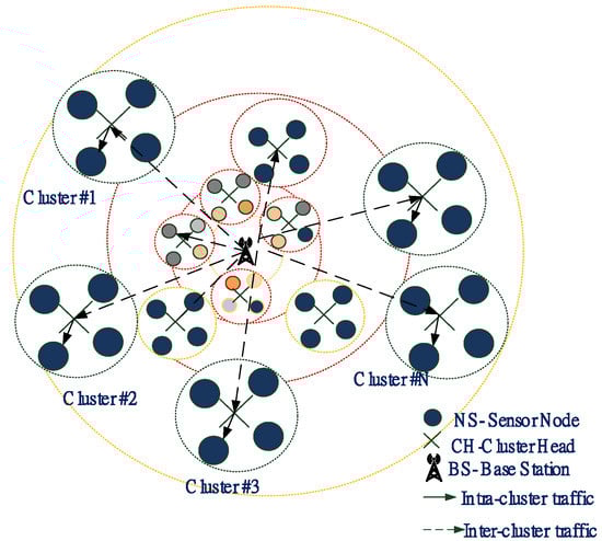 The clustering method in WSN is one of the most outstanding energy efficient ways of saving the energy network. The clusters are generated by arranging the sensor nodes into groups. A cluster has Node members (NM), and a Cluster head (CH) that are selected among NM. Clustering provides various advantages like energy efficiency, lifetime, scalability, and less delay. However, clustering can lead to a hot spot problem. Further, the unequal clustering technique is utilized for load balancing among CHs to prevent the network from developing a hot spot issue []. In uneven clustering, the cluster size varies proportionally to the distance to the base station (BS). Figure 1 shows the architecture of solving the unequal clustering in WSN. The size of the clusters would be reduced regardless of whether it is closer to BS.