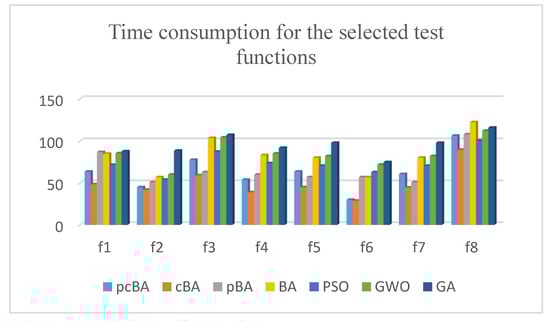 Table 9 compares the performance quality and running time for optimizing the objective function Equation (18) in WSNs of four methods of the , , , and the . Clearly, the average value of pcBA for the objective function is faster than those obtained by other approaches of PSO. The applied pcBA for optimizing the clustering WSN is not as different as convergence much of using BA. However, the total time consumption of pcBA method is fastest at only 2.045 min due to working memory variables being smaller. The obtained results are the average of the outcomes from all runs and are compared with a variety of versions of BA, and others in the literature.