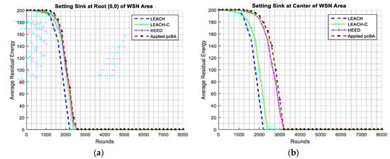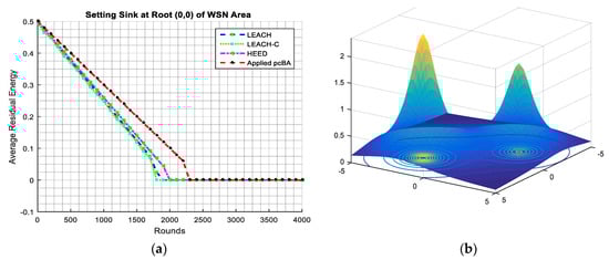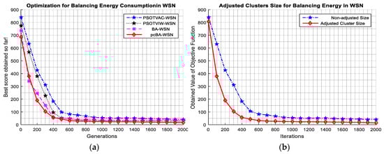 Comparison of the advanced pcBA with others for balancing energy consumption in WSNs. (a) Comparison of average outcomes of 25 runs of four approaches of applied , two cases of for minimizing objective function Equation (18); (b) Applied pcBA for adjusted distances of CHs to BS.