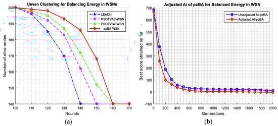 where and are the maximum and minimum distance from the CHs in the network to the BS; is the maximum value of competition radius; α is a weighted factor whose value is in [0, 1]; is the residual energy of CHj. Balancing the load of WSN based on clustering formation by updating Equation (7), and performing the optimal objective function by Equation (18) with the assistance of different distances Equations (19) and (20). Figure 6a depts the comparison of the applied pcBA for balancing energy consumption in WSNs with the BA, PSOTVW, and PSOTVAC approaches. It is seen that the applied pcBA outstands performance the other approaches in terms of coverage rate. Additionally, an adjusted distance of CHs to BS is applied to the pcBA for the objective function that obtained the better than nonadjusted length, as shown in Figure 6b.