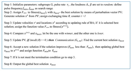 This section presents an improved BA based on hybridizing the parallel with the compact for the numerical optimization problems and balancing the energy consumption problem in WSN. The improvement BA is an extension of our previous works [,] that considered two techniques of parallel and compact. The parallel with a communication strategy is significant for computations that exchange information with other groups, share the computation load, and enhance the diversity of individuals [,]. The compact technique can offer an effective way of using a saving variable memory. An efficient compromise is used to present solutions of search space for the advantages of population-based algorithms without requirements of storing actual populations of solutions. The compact algorithm simulates the behavior of population-based algorithms by employing the replacement of a community of solutions with its probabilistic representation.