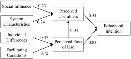 We got the path coefficients by SEM. Figure 3 shows that the seven standardization path coefficients are all above 0.01 and reached a significant level (<0.05), which means all the work hypotheses in this paper are acceptable. In detail, we find that (1) the key factors influencing the perceived usefulness of using online learning applications include system characteristics, social influence, and perceived ease of use, with coefficients of 0.74, 0.23, and 0.04, which indicate that system characteristics is the most significant factor to perceived usefulness. (2) The factors influencing perceived ease of use of online learning applications include facilitating conditions and individual differences, with coefficients of 0.72 and 0.37, which show that facilitating conditions are more important to the perceived ease of use. (3) The important factors influencing the usage intention of users for online learning applications include perceived usefulness and perceived ease of use, with coefficients of 0.51 and 0.83, which means perceived ease of use is more influential than the perceived usefulness to users’ continued usage intention for online learning applications.
