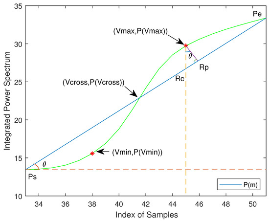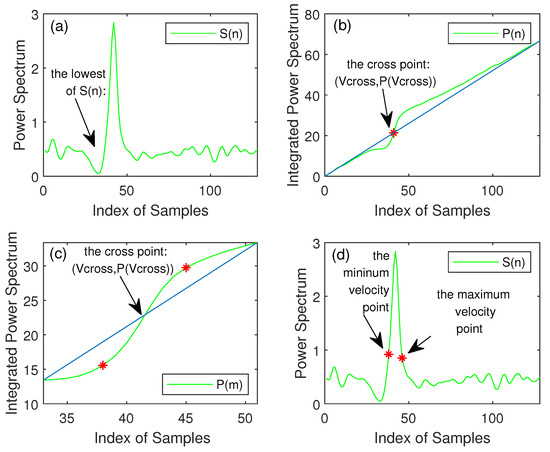 where is the horizontal ordinate of the intersection point, is the horizontal ordinate of the minimum point that is searched from to and this point is shown in Figure 1a. Equation (2) means that both of the data from S(1) to and the data from to are considered as noise. Thus, is a new integrated power spectrum, which is shown in Figure 1c.