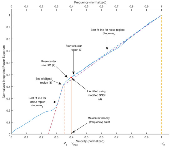 MSNSI is the modified method of SNSI. IPS is divided into three regions in this method. These three regions are the signal region, the knee region, and the noise region. All of these regions are shown in Figure 4. The signal region is defined as the full width at 70% of the signal peak in the power spectrum. is defined as the point of the end of the strong signal and is defined as the end point of the total signal. The knee center is identified based on an altered version of GM. It is located as the point on IPS that lies at a maximum distance from the reference line joining points on IPS corresponding to and . The velocity of knee center is equidistant from the velocity corresponding to the end of the signal region and the start of the noise region. Thus, the noise start point can be located when the knee center point and the end point of the signal region are defined. Two fit lines is used in this method: one line is in the signal region whose slope is and the other one is in the noise region whose slope is . All of above points in IPS are described in Figure 4. The slope of the points in the knee region is calculated by the following equation: