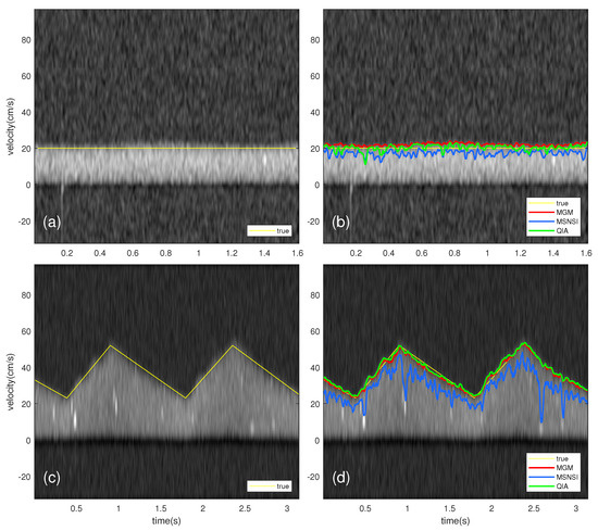True curve and results using MGM and MSNSI, QIA methods tested on steady phantom flow and pulsatile phantom flow. (a) the spectrogram of steady phantom flow with true curve; (b) the results of methods tested on the spectrogram of steady phantom flow; (c) the spectrogram of pulsatile phantom flow with true curve; (d) the results of methods tested on the spectrogram of pulsatile phantom flow.