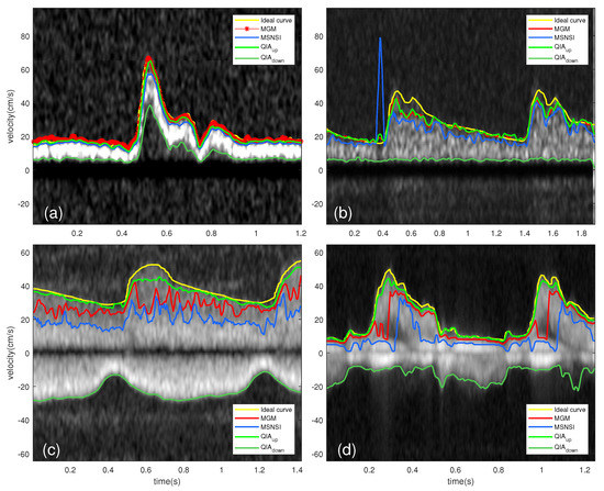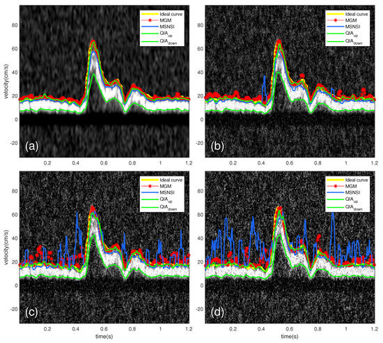 The envelope obtained from the proposed QIA, MGM and MSNSI were compared with the spectrum envelope drawn by an experienced clinician manually. Those above methods were tested on the spectrum of carotid artery and then noise was added to the ultrasound image to test the robustness of these methods. Using in-vivo data, Figure 6a illustrates the envelope obtained from the original signal without adding noise, while Figure 6b,d show the envelope estimation result of ultrasound image with the increasing noise added on the original signal respectively. SNR in Figure 6a–d is 21 dB, 19 dB, 18 dB and 17 dB, respectively.