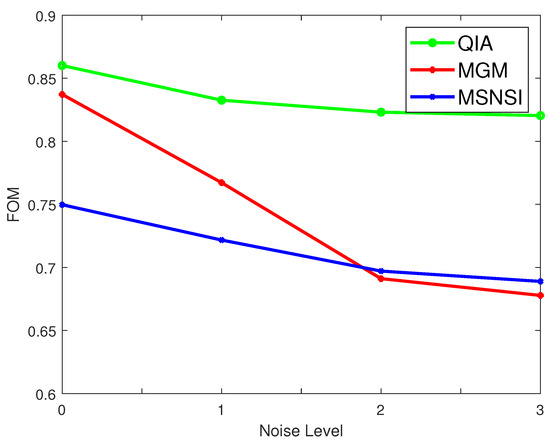 FOM of algorithms QIA, MGM, and MSNSI by varying variance of Gaussian white noise. No added noise is defined as Noise level 0, while Noise levels 1–3 represent increasing levels of Gaussian white noise.