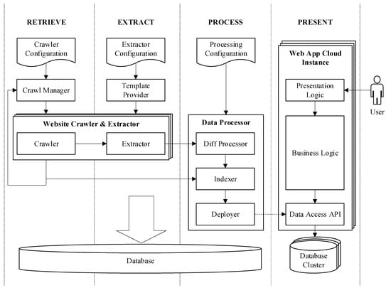 The proposed solution can be summarized by four actions: retrieve, extract, process, and present. Each action represents a stage in the information flow, and each one can be easily replaced with a different implementation. For many of the identified challenges, the chosen solutions are basic in the sense that they represent the path of least resistance to obtain the goal of having a cost-effective targeted shopping search engine hosted on a cloud platform. In addition, the retrieval, extraction, and processing actions are performed on a local server, while the presentation action is performed on a cloud platform. This decision was taken due to the fact that running computing-intensive tasks on the cloud incurs a higher cost, rather than running them locally and just uploading the results to the cloud platform. Of course, this is feasible only in certain conditions, which are discussed later in this paper.
