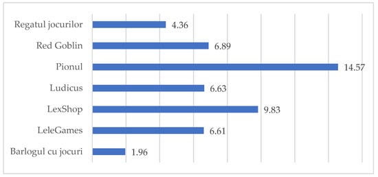 In order to minimize the number of pages that are processed, the information is extracted from multi-product pages. From a single webpage, on average, there are 17 unique products extracted. The advantage is obvious: less requests to the servers hosting the websites, less chance to ban the crawler for initiating too many requests, and most importantly, less time to extract the information. This works because we need only the bare minimum of information. On the other hand, for example, if one wants to also extract the product description, then the regular expression that matches the page URLs used for extraction will have to be changed to match single-product pages that have that description. Moreover, all of the custom selectors will have to be updated to the single-product page template. Figure 3 shows the number of extracted products per second from each considered retailer. These values depend mostly on the webpage content size and secondly, on the number of extracted pages and the number of products per page. For example, on the Pionul website, an average of 14.57 products/page were extracted, compared to 1.96 products/page on the Barlogul cu jocuri website, because the latter had a smaller average page content size. Considering all of the page processing times, it takes the longest time to retrieve the webpage, as can be seen in Figure A1 (in Appendix B), which shows the total sum of the processing times in relation to the total number of uniquely extracted products for each of the seven considered websites.