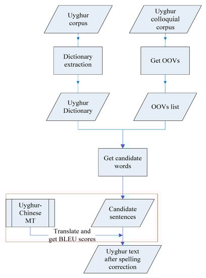 Using the BLEU score for spelling correction in an iteration. Generate Uyghur dictionary from Uyghur sentences in a bilingual corpus, the OOVs list from Uyghur colloquial, and then get all candidate words from the dictionary. Use candidate words to replace OOVs to generate candidate sentences. Translate candidate Uyghur sentences into Chinese sentences using Uyghur–Chinese machine translation, and then perform BLEU scores on sentences to return the highest scoring sentence. Candidates words contained in the sentence are the correct words.