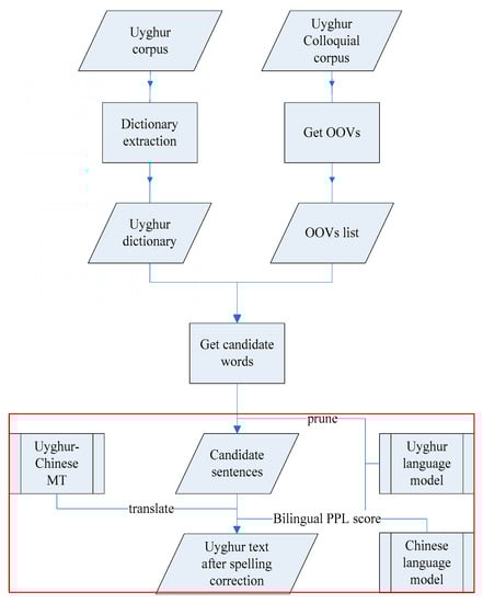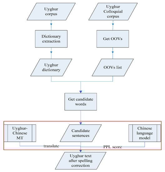 Using a Chinese language model (LM) for spelling correction in an iteration. Generate Uyghur dictionary from Uyghur sentences in bilingual corpus, the OOVs list from Uyghur colloquial, and then get all candidate words from the dictionary. Use candidate words to replace OOVs to generate candidate sentences. Translate candidate Uyghur sentences into Chinese sentences using Uyghur–Chinese machine translation, and then perform Chinese language model PPL scores on sentences, to return the highest score sentence. The candidate words contained in the sentence are the corrected words.