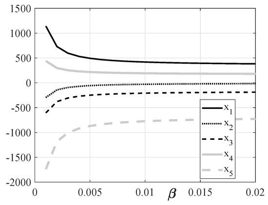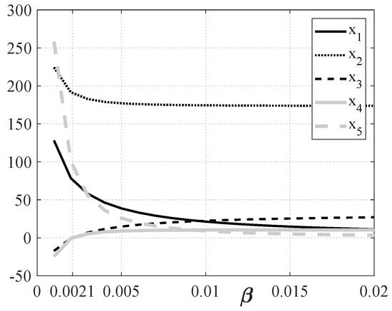There are two other solutions of the system (5)–(9), called and ; in Figure 2 and Figure 3 they are shown as function of , by plotting together the five components of each solution. It can be noted that in Figure 2 the component of the solution is negative up to a threshold value of , whereas from Figure 3 it can be observed that three components (, , and ) are always negative, and therefore is not an equilibrium point for any . For a small contact rate , there exists only one equilibrium point, , whereas for there exists also the second equilibrium point, now indicated by , whose components evolve as in Figure 2. The value of corresponding to the chosen parameters is equal to , as can be deduced from Figure 2.