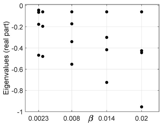 As for the second equilibrium point, , it has already been stated that it exists only for ; the analysis of its stability is rather complicated from analytical point of view. In Figure 4 the real part of the eigenvalues of the Jacobian matrix J, Equation (12), when evaluated for some values of , , , , , is shown. Please note that there exists a couple of complex eigenvalues with, as expected, the same real part.