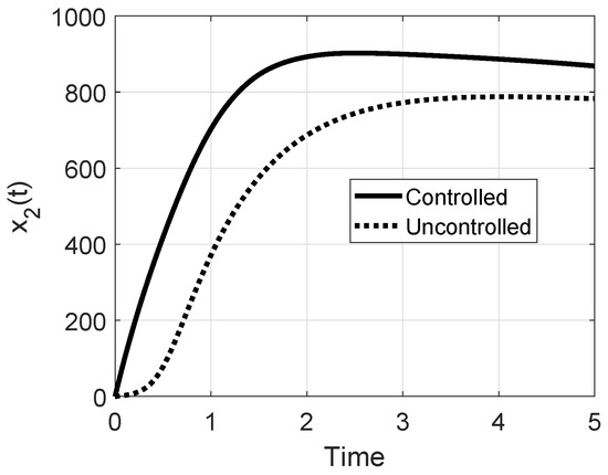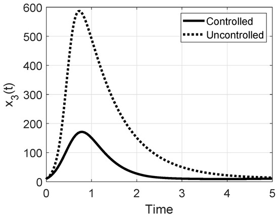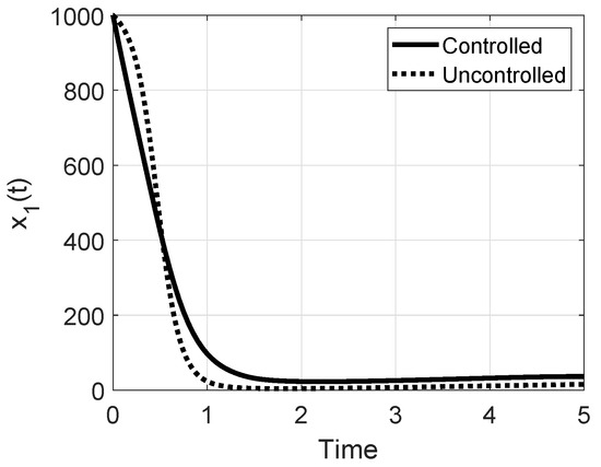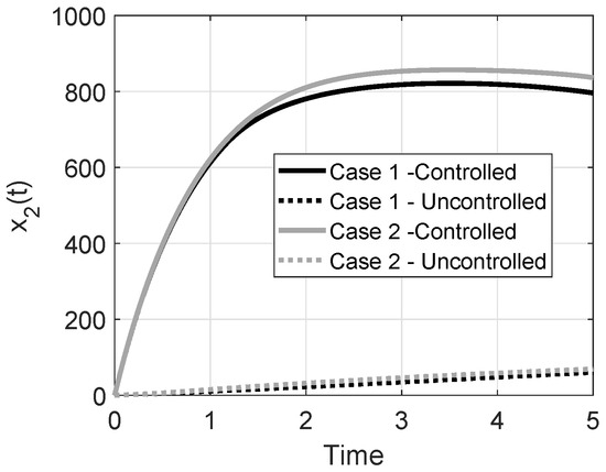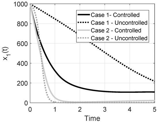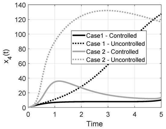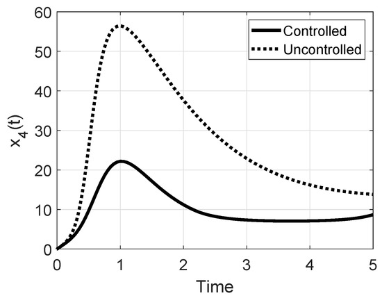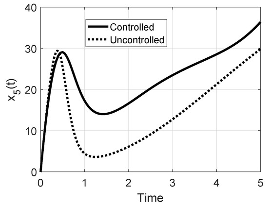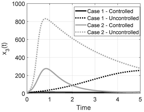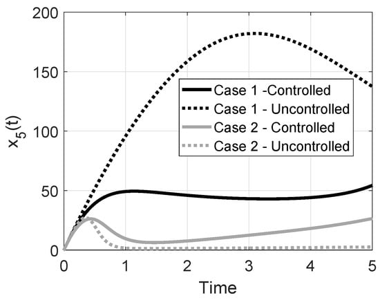In Figure 5, Figure 6, Figure 7, Figure 8 and Figure 9 the evolutions of the states , are shown along with the same quantities when no control is applied, comparing Case 1 and Case 2. The state evolutions corresponding to the immune subjects do not vary significantly in the two situations, whereas the dangerousness of Case 2 is evident in the non-controlled case for the evolution of and patients, reaching higher values than in Case 1, Figure 7 and Figure 8. Nevertheless, the control actions can reduce the peaks significantly.
