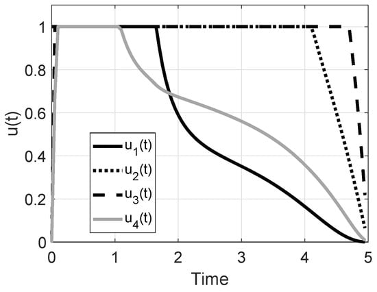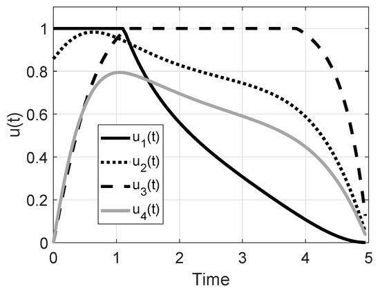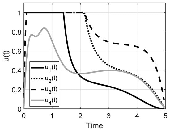 In Figure 10 the optimal controls , are shown for Case 1. The epidemic spread is not a risky one, the value of being small; nevertheless, the control actions allow the decrease of the number of subjects , , , as well as of the individuals, which also decreases without control, but less rapidly.