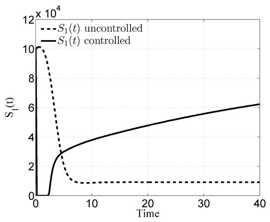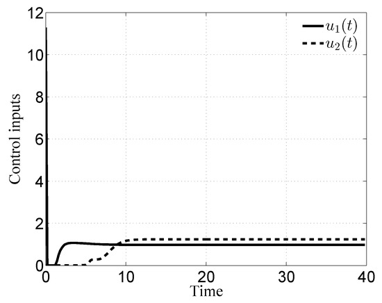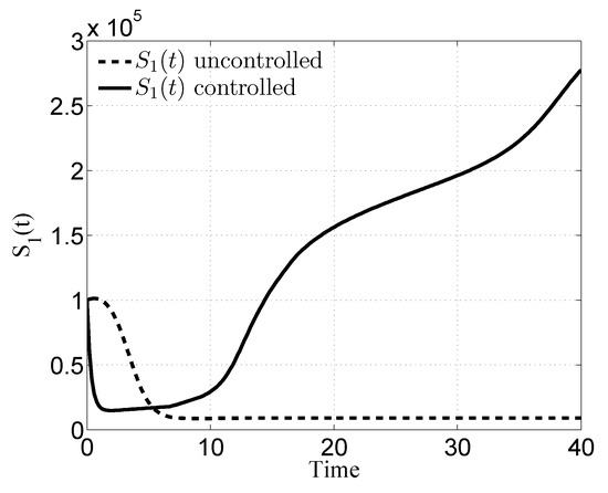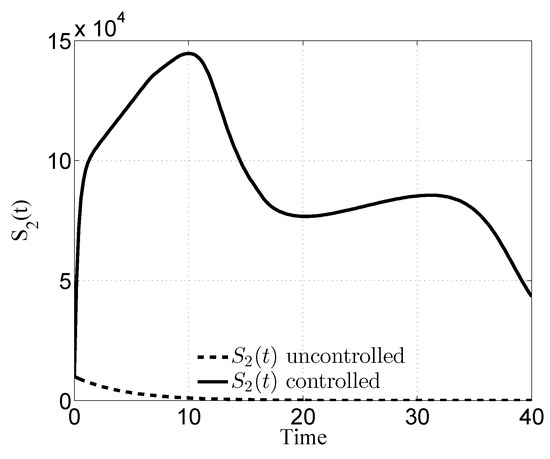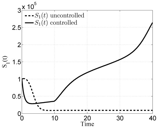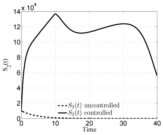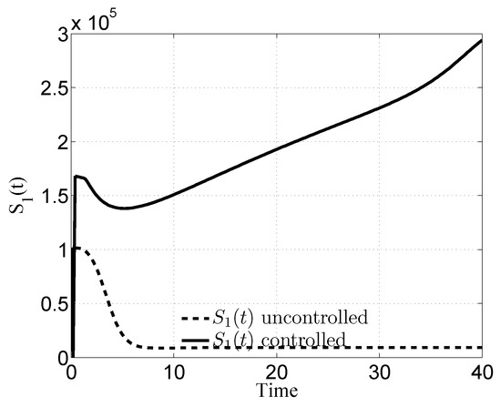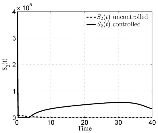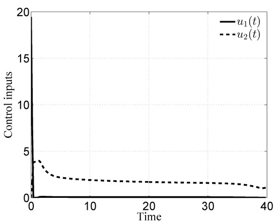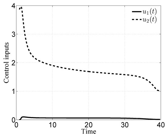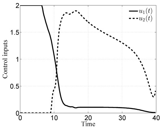 Numerical simulations are carried out and their results are reported in Section 3. It is here anticipated the observation that the effort required from control is very close to zero, meaning that the controls that actually produce effective actions are and . This remark is used from here on, for reducing the input size from three to two, ignoring, for sake of simplicity in the notations and in the computations, the third control, without loosing the quality of the results.