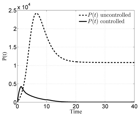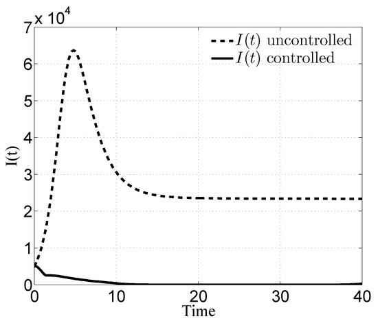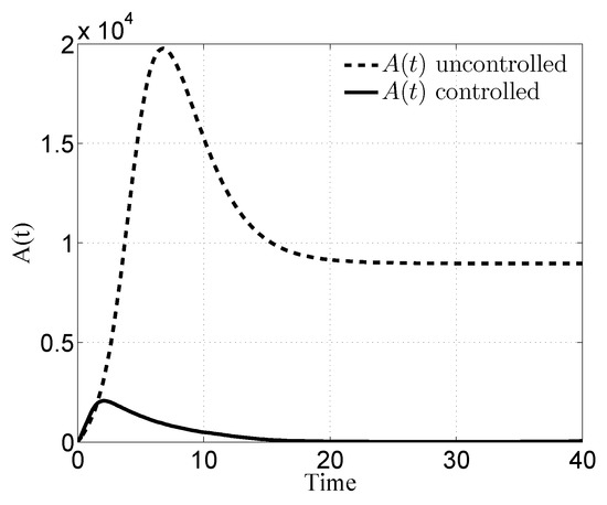 In this last case, a constraint like the one adopted in the previous case is considered but with the difference that the total budget available is common for both the controls. This means that the optimal control was formulated so that the optimal solution had to distribute the resources between the controls and over the time action. The expressions are the ones in (85) and (71),