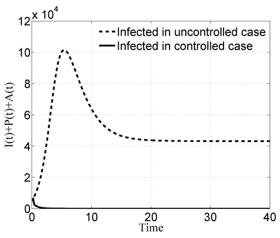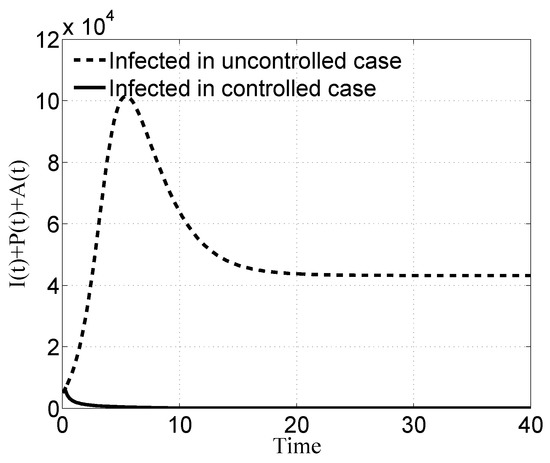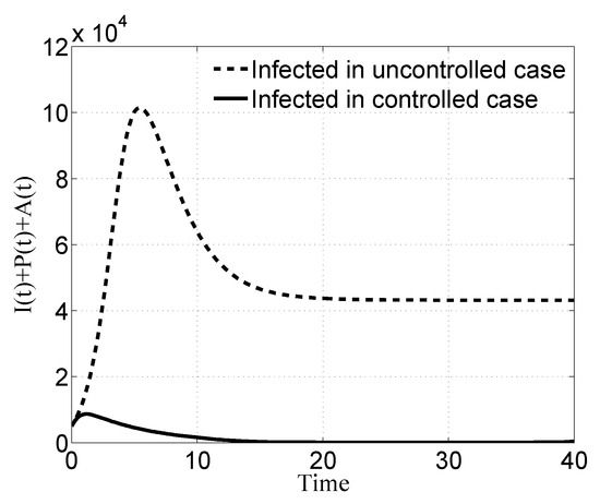 Also in this case, the overall effectiveness of the optimal control action is well evidenced from Figure 14, where the total number of infected people I, P and A is depicted along with the corresponding uncontrolled evolution, and from Figure 15, where the time history of the total population is reported. The shapes are very similar to the case .