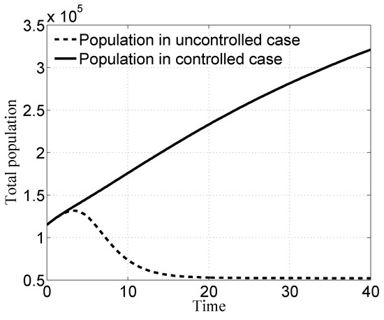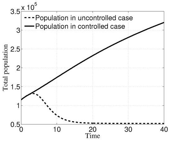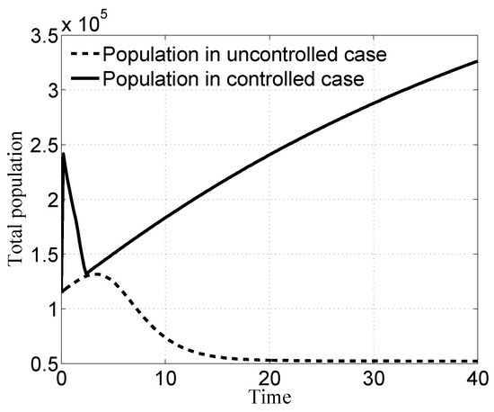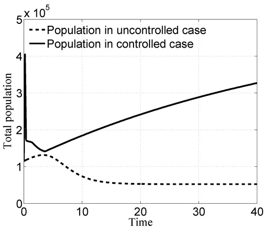 Case i [17]: time evolution of all the population, with and without the control actions.